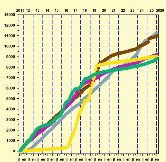 Éstos son, al día de hoy, el tercer grupo de cinco artículos más populares de mi página, es decir, del undécimo al décimo quinto. La gráfica representa las visitas acumuladas a todos ellos desde agosto de 2011 hasta la actualidad, mientras la tabla recoge el número total de estas visitas. Pulsando sobre los títulos se puede acceder directamente a su lectura.