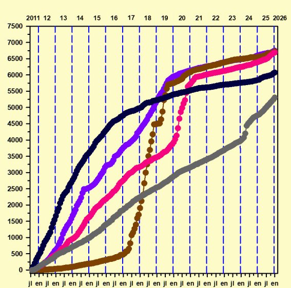 Éstos son, al día de hoy, el quinto grupo de cinco artículos más populares de mi página, es decir, del vigésimo primero al vigésimo quinto. La gráfica representa las visitas acumuladas a todos ellos desde agosto de 2011 hasta la actualidad, mientras la tabla recoge el número total de estas visitas. Pulsando sobre los títulos se puede acceder directamente a su lectura.
