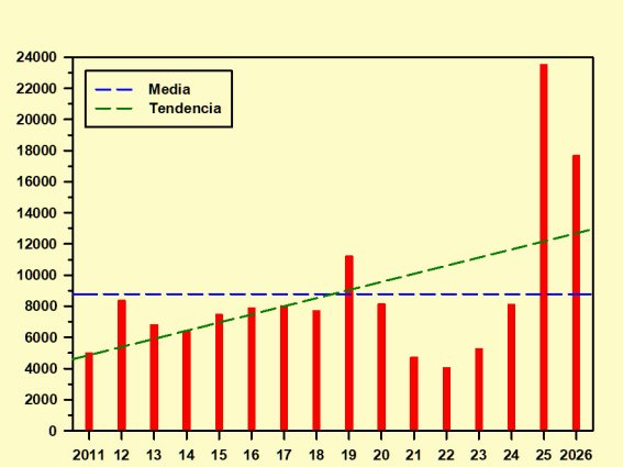 | Junio | 9.620 | 7.409 | 4.290 | 3.615 | 4.306 | 9.868 | 10.749 | |