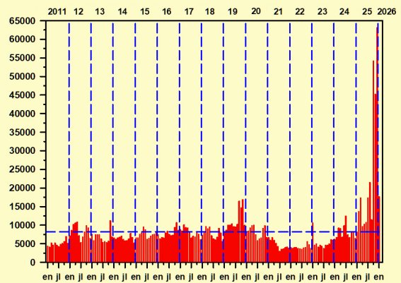 | Diciembre | 10.011 | 6.698 | 3.896 | 3.739 | 5.995 | 6.464 | 63.123 | |