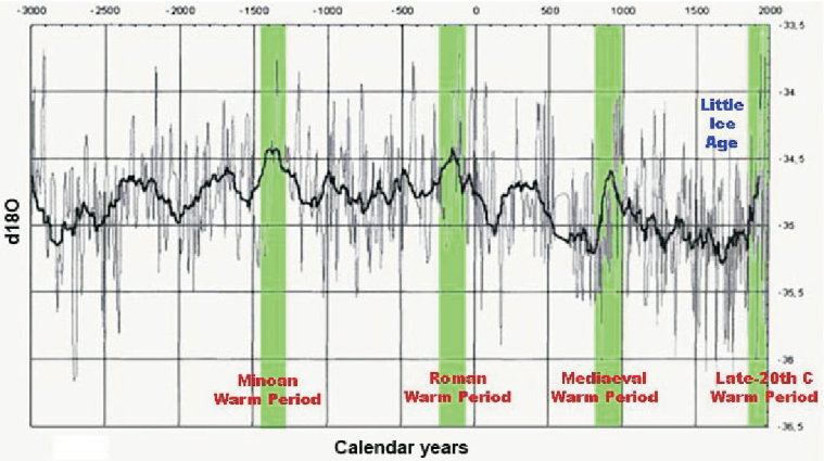 Durante los últimos miles de años fueron períodos cálidos el Minoico, unos 1.400 años antes de Cristo, que permitió el surgimiento de las primeras civilizaciones en el Creciente Fértil y el Egeo; el que marcó el apogeo de la cultura romana entre el 300 antes de Cristo y el 400 después de Cristo; el Óptimo Climático Medieval entre el siglo X y el XIV, o el actual desde aproximadamente mediados del siglo XIX. Entre ellos se intercalaron períodos fríos tales como la transición del Bronce al Hierro hace 2.500 años; entre los siglos V y IX -no es casualidad que los denominados Siglos Oscuros estuvieran marcados por las continuas migraciones de pueblos bárbaros-, y la mejor conocida Pequeña Edad de Hielo, que se desarrolló desde el siglo XIV hasta mediados del XIX.
