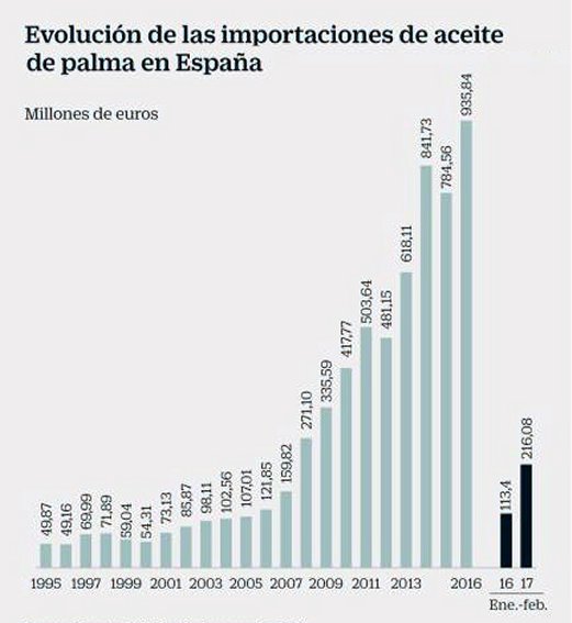 Una gráfica publicada recientemente en el suplemento Cinco Días de El PAÍS, con datos procedentes de la Secretaría de Estado de Comercio y de la Federación Española de Industrias de la Alimentación y Bebidas (FIAB), da buena muestra de como han evolucionado las importaciones de aceite de palma en España durante los últimos 20 años: de apenas 50 millones de euros en 1995 y poco más del doble (107) una década después, hemos saltado a los 936 de 2016, mientras la extrapolación de los dos primeros meses de 2017 a la totalidad del año roza los 2.000 millones de euros, más del doble de la cantidad del año pasado.