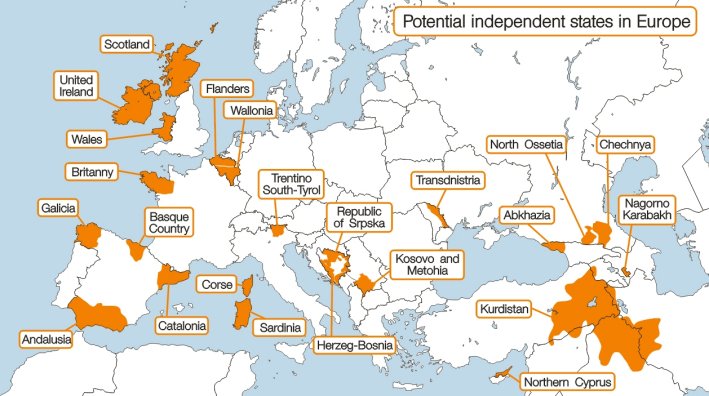 Francia, a su vez, tiene el problema del independentismo corso, en la actualidad adormecido pero no se sabe si definitivamente extinto, eso sin contar con un posible contagio, en caso de unas hipotéticas independencias de Cataluña y el País Vasco, a sus respectivos territorios reivindicados por ambos nacionalismos. Bélgica se encuentra, en la práctica, casi dividida en dos, con los flamencos como facción contestataria. En Italia es en el norte rico (la Padania) donde ha surgido un movimiento de rechazo al sur. Otros territorios con veleidades, si no marcadamente separatistas, sí de marcar en lo posible distancias con sus vecinos, son Baviera, Bretaña, Gales, quizá Irlanda del Norte si Gran Bretaña abandona definitivamente la Unión Europea, la República Srpska, Cerdeña, el Trentino, Silesia, Groenlandia, las islas Feroe... la mayoría de ellos, salvo la República Sprska, dependiente de Bosnia-Herzegovina, pertenecientes a países miembros de la Unión Europea, aunque las danesas Groenlandia y Feroe se autoexcluyeron de la misma.
